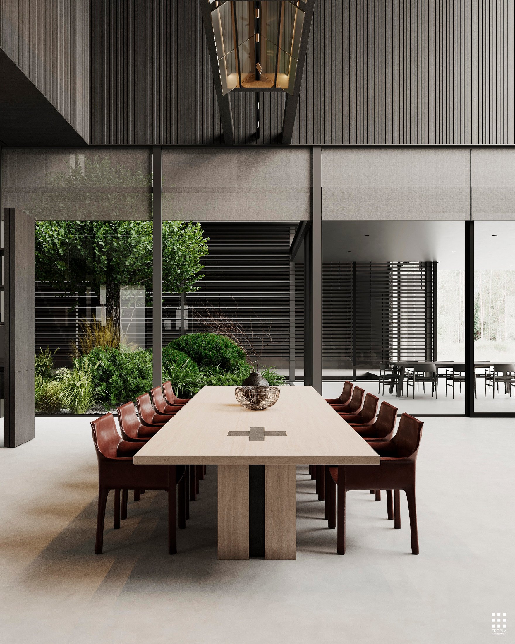 Фактурные поверхности, используемые в проекте, формируют глубину и тактильность, позволяя каждой плоскости взаимодействовать с естественным и искусственным светом. Это создаёт сложный, многослойный ритм интерьера.