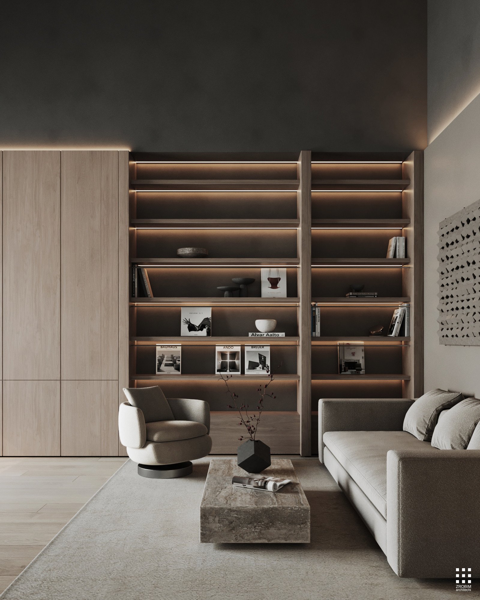 Пропорции, масштаб и материализация элементов выстроены в единую систему, где каждая деталь поддерживает общую архитектурную концепцию, а свет и фактура работают как инструмент композиции. Даже при использовании тёмной, насыщенной палитры интерьер остаётся тёплым, обволакивающим и визуально насыщенным, создавая пространство для разных сценариев жизни.